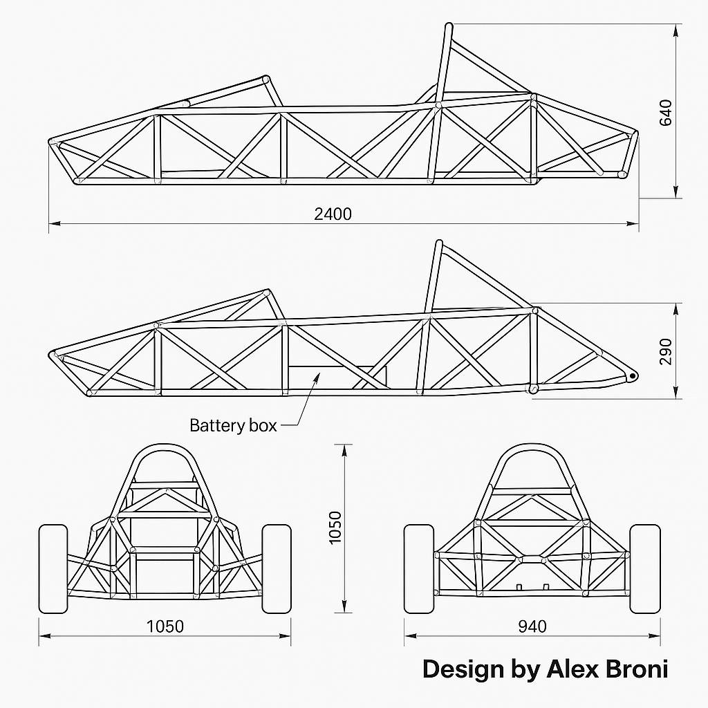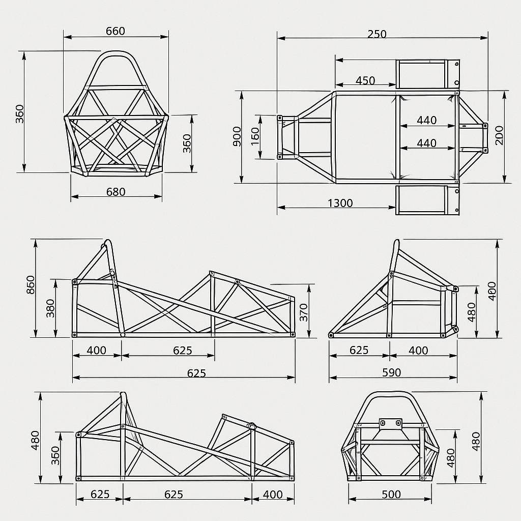 Side rails taper out slightly to carry wishbone loads: rear frame width 650–700 mm.